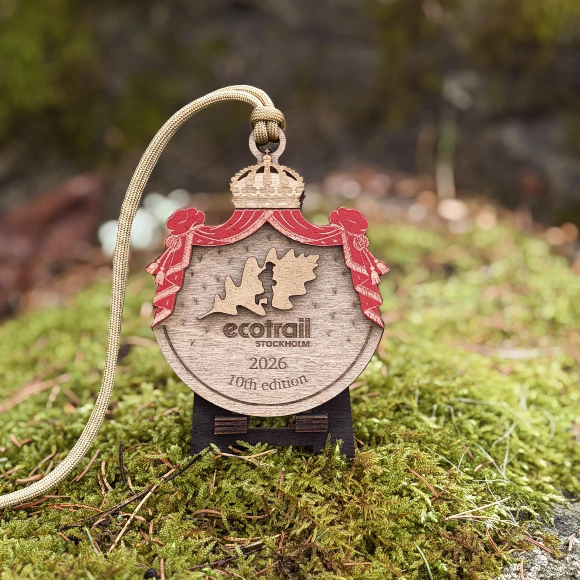 Årets medalj markerar en milstolpe – den 10:e upplagan av EcoTrail Stockholm – och knyter samman loppets historia med vårt kungliga arv. Likt tidigare år är medaljen tillverkad i trä och bär en tydlig koppling till Stockholms natur, kultur och historia. Designen, kronan och de dekorativa draperingarna anspelar på det kungliga riksvapnet. Kronan symboliserar inte bara Sverige utan också Djurgårdens historia som kunglig mark – den plats där loppet till stor del avgörs. Dessutom tycker vi den känns härligt festlig och vad är inte bättre än en smått ceremoniell medalj när det är jubileum? 2026 års medalj sammanfattar våra hittills 10 år med EcoTrail Stockholm. Som jubileumsmedalj representerar den inte bara ett genomfört lopp, utan också tio år av upplevelser, prestationer och gemenskap i Stockholms unika natur!